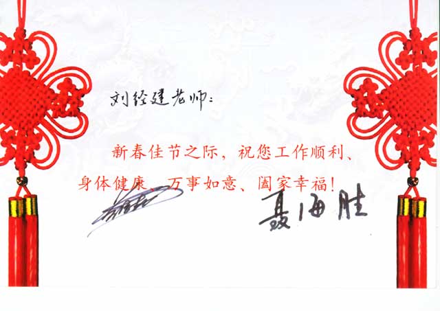 航天英雄聂海胜、费俊龙为我校参与神六飞船研制工作的机械与车辆工程学院刘经建老师发来新年贺卡。