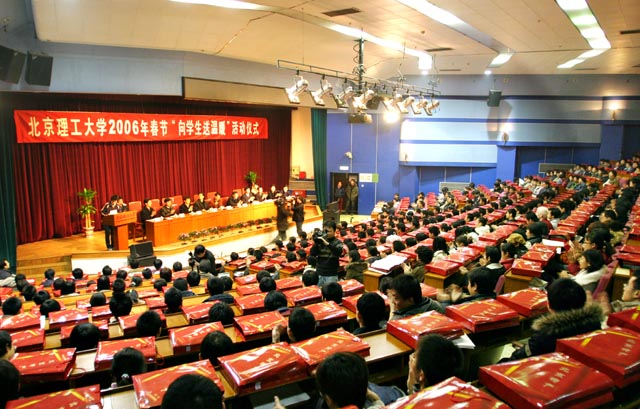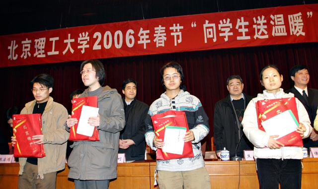 1月20日下午,中心教学楼一层报告厅内暖意融融, 德赢AC米兰中国官方网站500余名贫困学生济济一堂,参加了由学校组织的2006年春节“向学生送温暖”活动仪式。校领导,党办、校办、党委宣传部、党委组织部、教务处、 研究生院、招生就业工作处等有关部门负责人出席了活动仪式。长期以来,学校党委和行政部门十分重视我校学生的经济资助工作,“向学生送温暖”活动在我校连续举行了八年,已成为具有理工大学传统特色的活动之一。