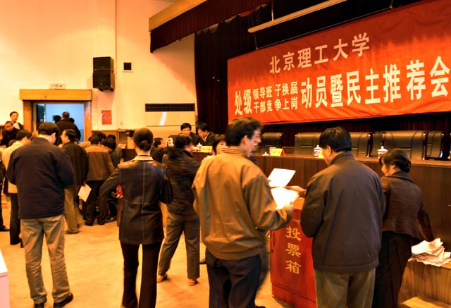 处级领导班子和干部竞争上岗作为今年工作中的重中之重列在显要位置,这是全校政治生活中的一件大事,会上对学校正处级领导岗位人选进行了民主推荐。与会代表以高度的政治责任感,认真地填写了选票,推荐了自己认为合适岗位人选的名字。