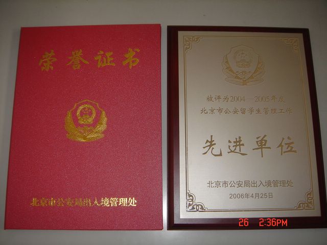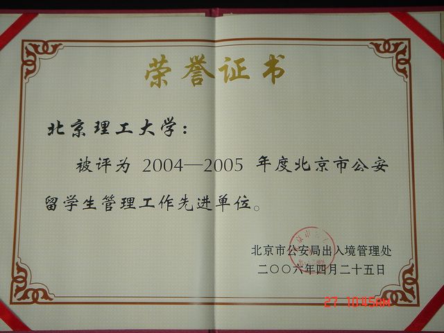 4月25-26日,北京市公安局出入境管理处召开“北京市公安外国留学生管理工作会议”,北京市外事办公室涉外处、北京市教委国际合作处等部门的领导和北京市69所招收留学生的高校和69所招收留学生的中小学代表参加了会议。会上10所高校、5所中小学被评为“2004-2005年度北京市公安留学生管理工作先进单位”。我校是连续第三次被评为先进单位。这一成绩的取得首先是校领导的正确领导和校内各有关部门、学院的大力支持,留学生中心、后勤集团、房地产办公室共同努力的结果。