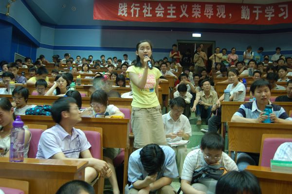 在演讲过后的交流环节中,同学们争先恐后的举手提问,整场讲座同学们通过直接提问或写纸条提问的方式向孙大使提出了约20多条问题,问题的内容涉及印度政府对达赖喇嘛的态度、阿富汗妇女的社会地位、如何做一名出色的发言人、中印领土争端等,在提问过程中,按照孙大使的要求,给坐在过道和台阶上的同学优先提问的机会。
