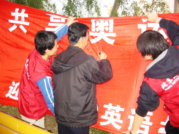 热心的一些市民同志在赞赏我们义务宣传奥运的同时还提出了很多好的建议,值得我们借鉴。每个前来观看的市民都在“新北京,新奥运,我们都在努力中……”的横幅上庄严的签上了自己的名字,并留下了对08奥运的寄语,这既是一份对奥运的期待,也是一份对祖国未来的祝福…… 。活动在进行了将近两个小时后结束,同学们忍受着寒冷自始至终都保持着高昂的激情在自己的岗位上一丝不苟的工作,为奥运宣传添姿添彩。