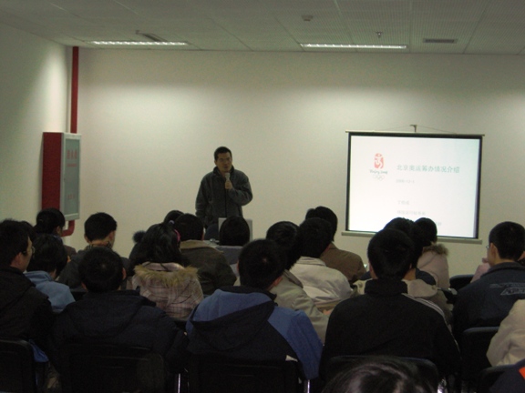 丁伯成秘书长首先就目前北京市的奥运筹备情况为大家作了介绍,内容主要涉及到奥运场馆建设,志愿者招募情况和奥运筹备的一些最新进展,特别介绍了奥组委的工作运行机制和他所负责的北区各场馆的准备情况,特别是他在雅典奥运会的实习工作经历,更是引起了同学们极大的兴趣。