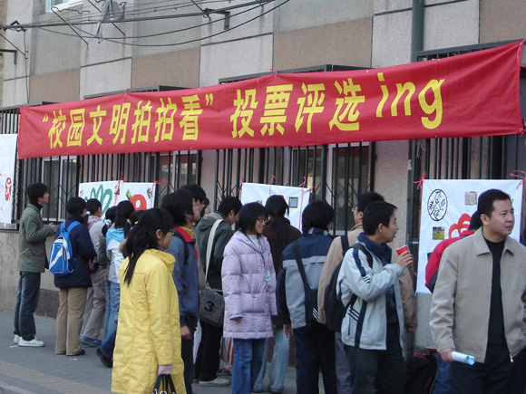 此次“校园文明拍拍看”数码摄影大赛立足校园,放眼奥运,旨在通过大家手中的镜头,“我观、我察、我拍、我管”,关注在校大学生的日常生活,倡导大学生真正在迎接奥运的一年多的时间里从身边的点点滴滴做起,展现文明古国的魅力,为迎接奥运贡献自己的力量。