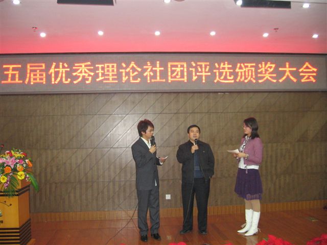 随后,举办了隆重的颁奖典礼,在颁奖过程中,两位主持人对杨宾副书记进行了采访,杨宾副书记充分肯定了我校学生理论社团在学生党建工作、大学生思想政治素质建设中起到的重要作用,同时指出,当前大学生应加强自身理论建设,树立牢固的共产主义信念,积极投身社会主义和谐社会的建设中。
