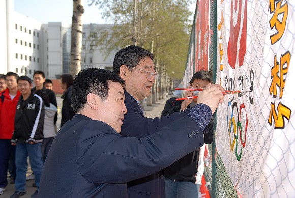 校党委书记焦文俊老师和校党委副书记、副校长杨宾老师共同为图像展收笔并为奥运会倒计时牌揭幕。