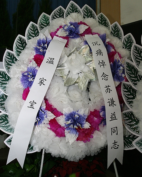 向苏谦益同志敬献花圈的有:党和国家领导人温家宝、曾庆红、贺国强、曾培炎、王 刚、刘云山、李源潮、陈至立、乌云其木格、陈奎元、布赫(原全国人大副委员长)、郑天翔 (原最高人民法院院长);现任省部级及上级主管部门领导内蒙古自治区党委书记、自治区人大主任储波,内蒙古自治区副书记、自治区政府主席杨晶,北京市委常委、教育工委书记朱善璐,北京市副市长孙安民,新华社社长田聪明,北京市教委主任刘利民;我校党委书记焦文俊、校长胡海岩、名誉校长王越;还有内蒙古自治区现任其他领导、学校原主要领导及离休校领导等。
