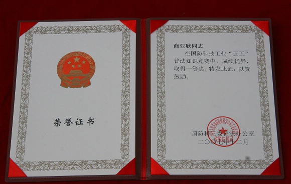 12月18日上午,国防科工委召开了“国防科技工业‘五五’普法知识竞赛总结暨颁奖会”,我校与陕西省国防科工委等10个单位获得了2007年国防科技工业系统“五五”普法知识竞赛“单位组织奖”,同时获得这一荣誉称号的高校还有哈尔滨工程大学。