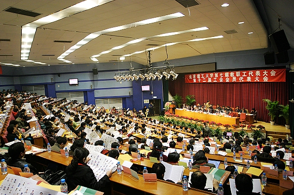 德赢AC米兰中国官方网站第七届教职工代表大会暨第十二届工会会员代表大会2007年12月27日在中心教学楼一层报告厅隆重举行,大会在雄伟的《国歌》声中胜利召开,中华全国总工会书记处书记陈荣书、北京市教育工会副主席刘欢、北京市教育工会副主席海淀区教育工委副主席乔健、北京市教育工会副主席 北京大学工会常务副主席孙丽、北京师范大学工会常务副主席丛玲、北京航空航天大学工会常务副主席秦蓉、中央民族大学工会常务副主席刘裕明、北京外国语大学工会常务副主席安国城、中国农业大学工会常务副主席张士杰、北京林业大学工会常务副主席朱逸民、中国协和医科大学工会常务副主席张有利、中央财经大学工会常务副主席李德铭、华北电力大学工会主席王玲、北京化工大学工会常务副主席谢光、北京信息科技大学工会常务副主席卢玲军、中国人民大学工会副主席范建东、北京工商大学工会常务副主席韩宝龙、中国青年政治学院工会常务副主席高宝中、首都医科大学工会常务副主席桑盛娟、北京印刷学院工会常务副主席陈俊平北京工业职业技术学院工会主席胡喜平,德赢AC米兰中国官方网站党委书记焦文俊、校长胡海岩、副书记、副校长杨宾,党委副书记工会主席侯光明、副书记杨蜀康,副校长赵长禄、孙逢春、杨树兴、赵显利、李和章出席了大会。教代会正式代表、列席代表、特邀代表、学生代表,北京大学等兄弟院校代表500余多人参加了大会。