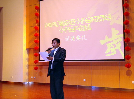 2007年12月29日晚,宇航学院在良乡校区演艺厅举办了“宇人祝福”2008新年晚会暨宇航学院2007年度十佳杰出青年、十佳杰出团队颁奖典礼。全院师生济济一堂,共同庆祝2008新年的到来。整场晚会温馨、欢快、和谐,宇航学子深深感受到了宇航大家庭的温暖。
