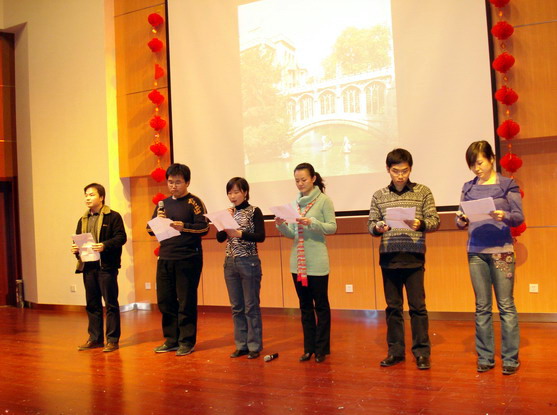 良乡校区2007级新生精心准备了此次新年晚会,他们自编自演的话剧、相声、舞蹈、吉他弹唱,充分展现了宇航学子的风采。焦清介老师和李东光老师表演的京剧《我们是工农子弟兵》,以及分团委老师表演的配乐诗朗诵《再别康桥方言版》,更是将晚会推向了高潮。