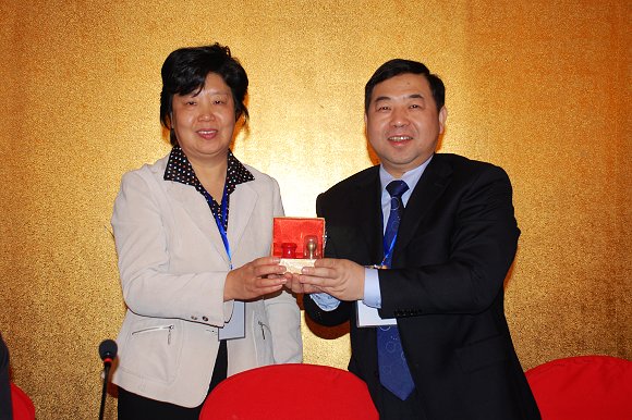 研究会第三届理事长北航副校长唐晓青将研究会印章交给杨树兴理事长