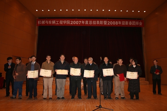 2008年1月18日,机械与车辆工程学院2007年度总结表彰暨2008年迎新春团拜会隆重举行。校党委书记焦文俊、全院在职教工、离退休老教师和学生代表欢聚一堂,对2007年度学院优秀集体及个人进行表彰与总结,并开展全院2008迎新春团拜会联欢活动。副院长丁洪生主持总结表彰会。