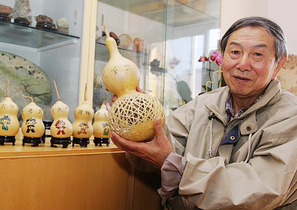 “葫芦在我国一直都是吉祥的象征,用葫芦做迎接奥运的工艺品,是表达我对北京奥运的一份祝福,我参与,我奉献,我快乐。”已经73岁高龄的周老师说。周本相老师热爱艺术,自退休以来,悠游于绘画、雕刻等艺术活动,既陶冶了情操,又丰富了生活。据他介绍,这套奥运葫芦工艺品从去皮、绘画到雕刻都由他自己独立完成,耗时三个半月。