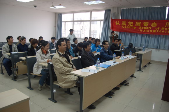 在机车学院2007级车辆一班的德育论文开题会上,戚志治同学幸运地被我校党委书记郭大成老师“抽中”成为全班第一个上台进行德育论文开题的学生,郭书记亲切的邀请这个“幸运”的蒙古族男生在讲台上合影留念。