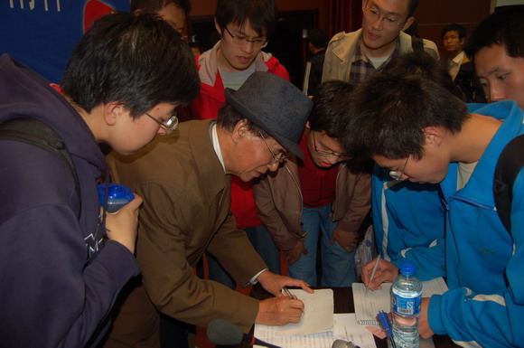 长达3个小时的讲座结束后,同学们纷纷请王教授为自己签名留念,王教授欣然接受了同学们的请求。