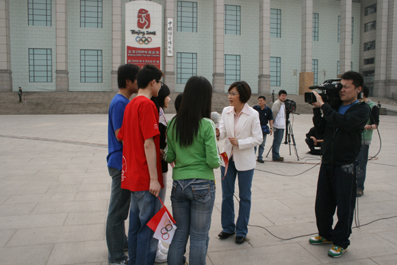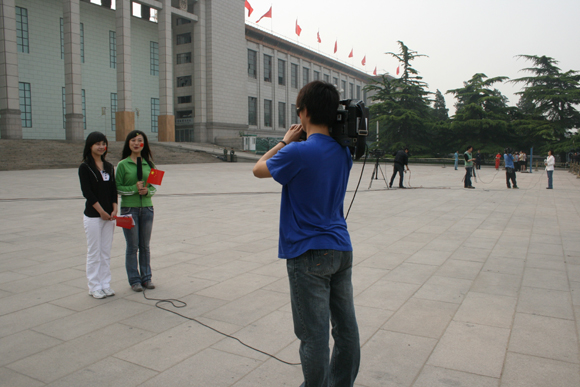 我校学生电视台作为唯一的校园媒体,在活动现场和中央电视台的记者一起对相关活动进行了采访报道。(上图为我校学生电视台摄像和记者在进行现场采访)