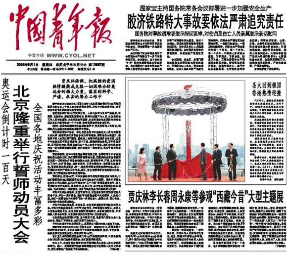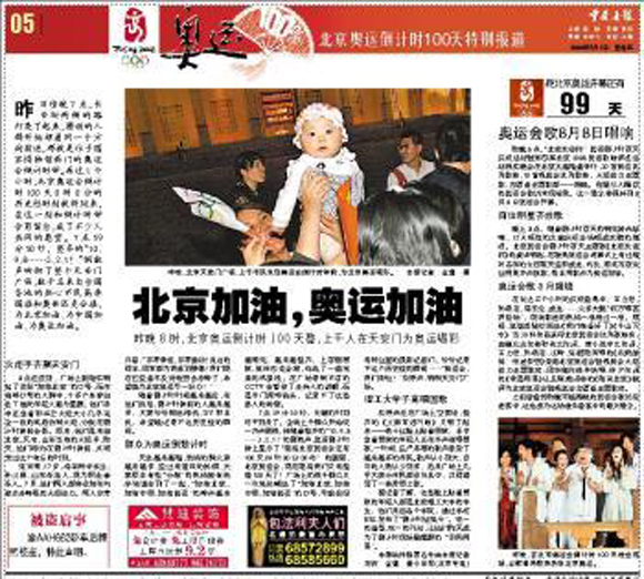 中国青年报 头版头条 《奥运会倒计时一百天北京隆重举行誓师动员大会》