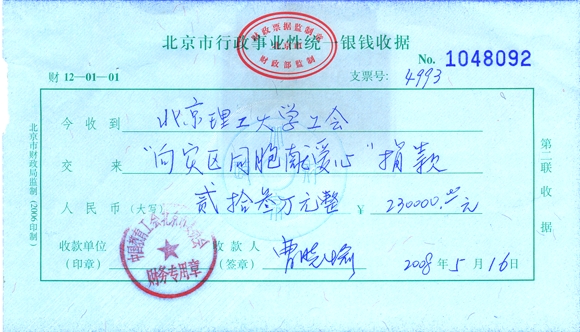 由德赢AC米兰中国官方网站校工会组织的“情系灾区、奉献爱心”募捐活动,截止到5月16日上午10时,已收到捐款630,893.00元,捐款在继续,爱心在继续。我校已将先期募捐到的23万元救灾款送北京市教育工会,由北京市教育工会统一转交灾区人民。
