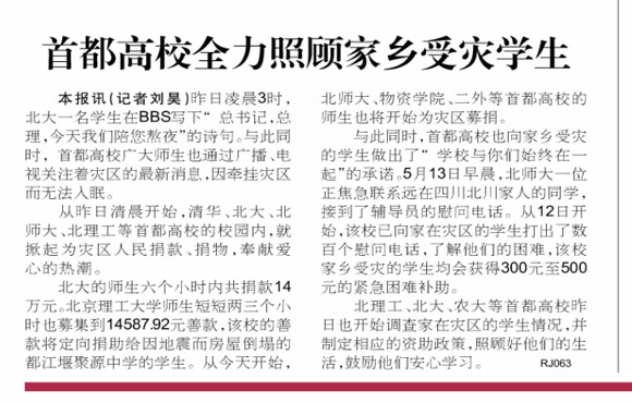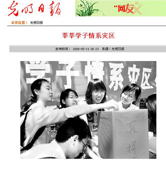 光明日报5月14日 第2版《莘莘学子情系灾区》(图文)