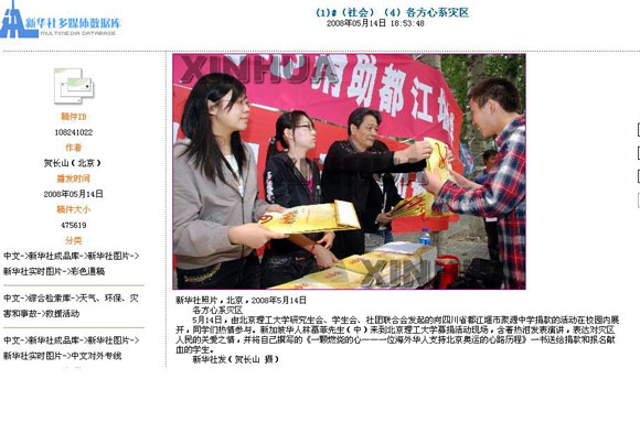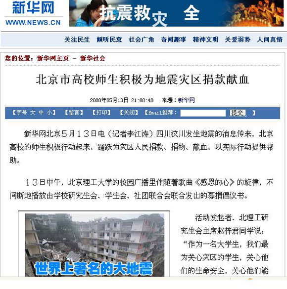新华社:5月13日 《北京市高校师生积极为地震灾区捐款献血》