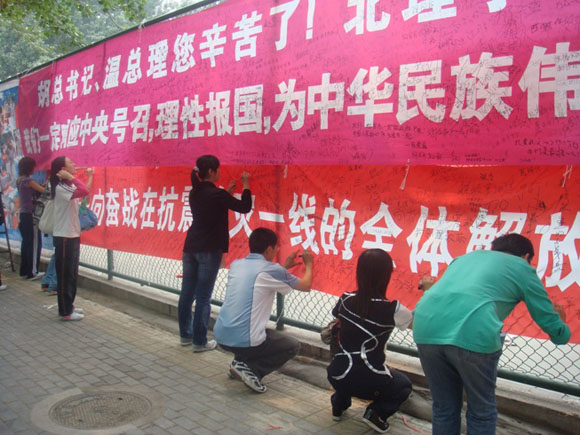 5月16日我校在新食堂对面的募捐点举行了向胡总书记、温总理以及抗震救灾解放军战士致敬的签名活动,同学们纷纷在“北理学子向奋战在抗震救灾一线的全体解放军官兵致敬”、“胡总书记、温总理您辛苦了!北理学子向您致敬!我们一定响应中央号召,理性报国,为中华民族伟大复兴奋发成才!”签上了自己对胡总书记、温总理和抗灾一线解放军官兵的支持和祝福。