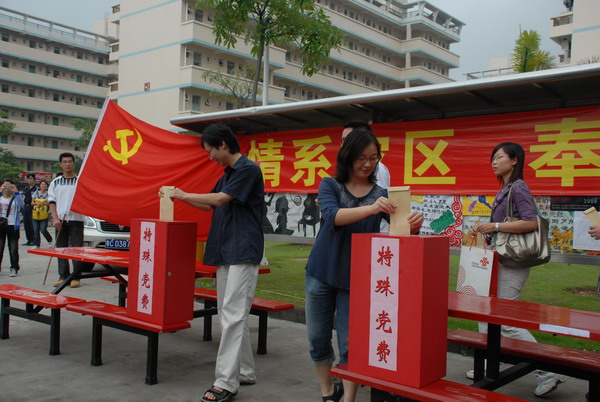 5月22日中午12:10分,珠海学院500多党员聚集在学生第一食堂前,以饱满的政治热情参加了交纳“特殊党费”活动。学院党委书记刘淑艳等领导带头捐款,党员们把装好捐款的信封投进了写有 “特殊党费”四个字的捐款箱,热切表达了一个共产党员支援灾区的心愿和做好本职工作的决心,以实际行动讲党性、重品行、作表率。其中大部分党员已参加了多次赈灾捐款,仍然积极响应号召投身其中;在现场,一批入党积极分子也踊跃参加捐款,他们希望尽自己的绵薄之力帮助灾区人民渡过难关,重建美好家园,同时也表达他们以更高的标准要求自己,积极向党组织靠拢的决心。与此同时,珠海学院党委还要求各党总支、直属党支部要在抗震救灾中充分发挥战斗堡垒、模范带头和先锋模范作用,要及时了解家在灾区的教职工及学生的情况,主动帮助他们解决困难,充分体现党组织的关怀和温暖。