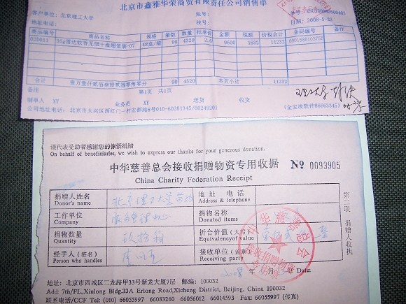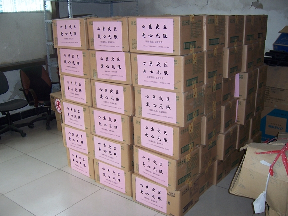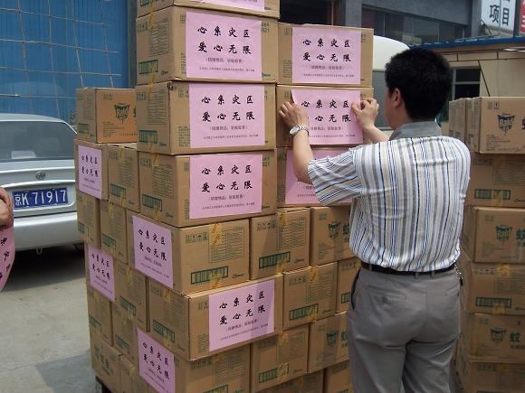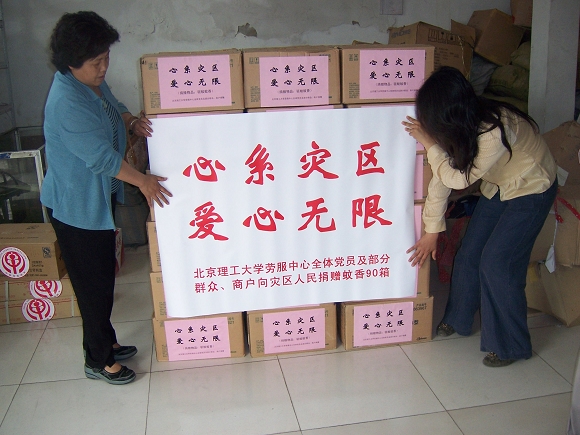 从5月21日下午到5月23日上午10点的40个小时之内,共捐款1万余元,购买雷达牌无烟蚊香90箱,市场价值达12000元。5月23日这天,劳服中心党支部的部分党员和群众代表一起来到蚊香供应点,他们将一张张精心制作的“心系灾区、爱心无限”的标语贴在每一个蚊香包装箱上面,随后他们又一起来到中华慈善总会抗震物资捐赠点,通过他们把这一箱箱饱含“劳服人”深情的驱蚊蚊香带到灾区,为灾区人民减轻痛苦,做出微薄的贡献。