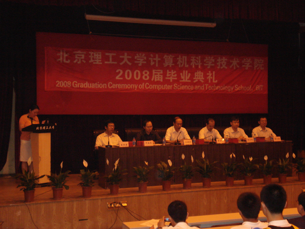 2008年6月24日,计算机科学技术学院2008届本科生毕业典礼在七号楼报告厅胜利召开。出席此次典礼的领导有计算机科学技术学院党委书记王树武老师、常务副院长贾云得老师、副院长牛振东老师、副书记、副院长陈旵明老师、院长助理李仲君老师、办公室主任余海滨老师以及教师代表廖乐健教授。2008届本科生辅导员及班主任以及全体2008届本科生参加了此次典礼。毕业典礼由计算机科学技术学院分团委书记胡晓艳老师主持。