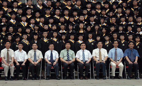 在毕业典礼举行之前,校领导与优秀本科毕业生代表在中心教学楼前合影留念。 衷心希望同学们“脚踏实地,求真知,潜心磨一剑,情系母校书答卷;志存高远,作脊梁,展翅冲九霄,心怀祖国写华章。”