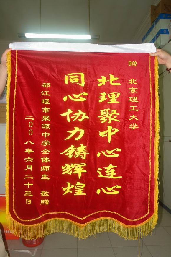 近日,我校收到了来自都江堰聚源中学寄来的锦旗,上面印有“北理聚中心连心 同心协力铸辉煌”的字样。随后,都江堰聚源中学的校长古胜老师通过电话再次表达了对我校师生的谢意,并期望在我校广大师生的进一步帮助下让受灾学生尽快走出地震带来的阴影,为他们创造更好的成长成才环境。