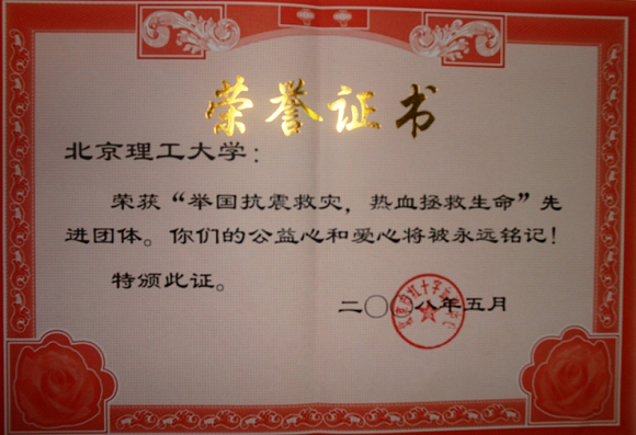 2008年7月2日在北京红十字血液中心业务楼三层报告厅,隆重举行了抗震救灾志愿无偿献血工作表彰大会。会上,我校被授予了“举国抗震救灾,热血拯救生命”先进团体的荣誉称号。