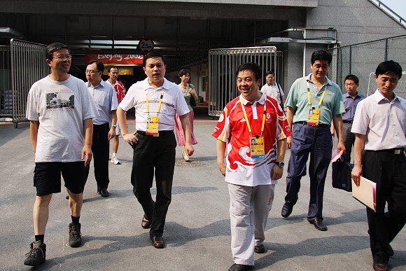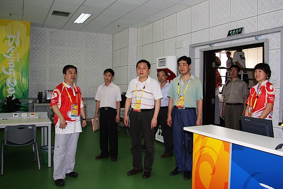 北理工体育馆场馆主任杨宾同志向胡海岩一行详细介绍了场馆各个功能区的建设和筹备情况。胡海岩一行仔细查看了场馆的交通运输指挥系统,安全保卫系统,运动员、技术官员、新闻媒体、贵宾、观众、工作人员等奥林匹克大家庭成员的工作和休息场所,以及奥运会排球馆和残奥会盲人门球馆。
