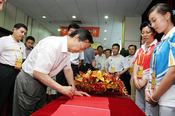 李毅中部长在我校奥运场馆签字。