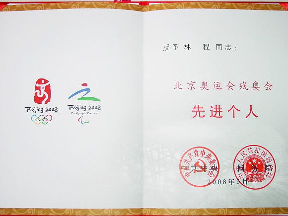 我校机械与车辆工程学院电动车辆工程技术中心(电动车辆国家工程实验室)林程教授荣获“北京奥运会残奥会先进个人”光荣称号,并于9月29日出席了在人民大会堂隆重举行的“北京奥运会残奥会总结表彰大会”,获得了由党中央和国务院授予的先进个人荣誉证书和奖章。