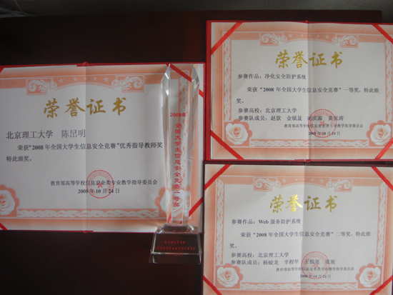 “2008年全国大学生信息安全竞赛”由教育部高等学校信息安全类专业教学指导委员会主办,大赛评审专家组组长为教指委主任委员沈昌祥院士。大赛历时5个月,参加本次比赛的共有来自全国54个高校的258支队伍。通过初赛、复赛的筛选,最终只有73支竞赛队进入决赛,决赛于2008年10月22日至10月25日在成都电子科技大学拉开战幕,来自全国各大高校的73支代表队、200余名队员上演一场智慧与创造力的较量。大赛决出了一等奖10名,二等奖15名。
