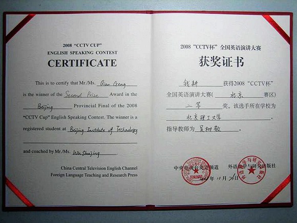 于2008年10月25日举行的2008“CCTV杯”全国英语演讲大赛北京赛区初赛共有49所高校的49名同学参赛,参赛选手多为英语或相关专业,共有15名选手进入次日的决赛。我校宇航科学技术学院08级博士钱耕同学在院长吴树敬老师的指导下,在初赛中表现优异成功晋级决赛,并在决赛中荣获二等奖。