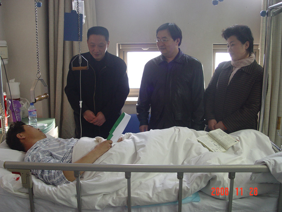 11月28日下午,后勤集团党委书记巫后新、工会主席姜金凤、工会副主席宋希博、办公室主任李秋香、物业中心副主任聂正喜、高建利再次前往医院,将这笔爱心捐款送至许七四病床前。集体的温暖、同志们的关爱,使这条昔日的硬汉热泪盈眶,我们衷心的希望许七四同志能够勇敢的面对这次人生的挫折,努力进行康复治疗,重新燃起生活的信心。寒山碧水,惟情不老,萧萧故垒,惟爱永生。