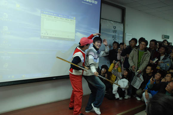 在同学们的踊跃的提问中,章老师对同学们十多个问题进行了详尽的解答。管理与经济学院的华晨同学非常幸运的上台向章老师求艺。章老师亲切地对华晨同学进行了指点,并纠正了他动作的偏差。