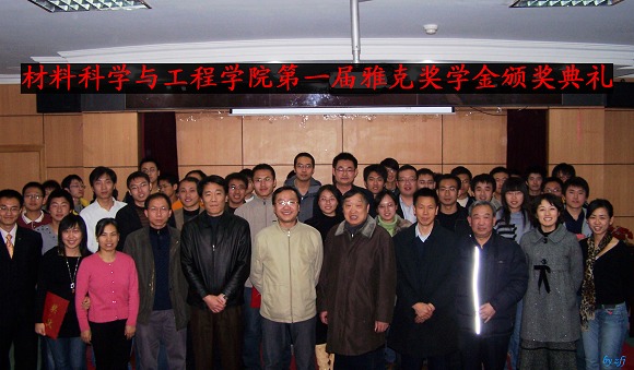 2008年12月1日,材料科学与工程学院第一届雅克阻燃基金颁奖典礼在逸夫楼报告厅隆重举行。雅克科技股份科技有限公司董事长沈锡强、技术总监吴仁铭、材料科学与工程学院分党委书记张德平、院长王鲁、副院长杨荣杰、副院长刘景胜、副书记副院长韩笑出席了本次颁奖典礼。