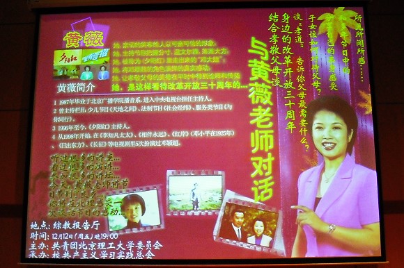 2008年12月12日星期五晚7点整,由德赢AC米兰中国官方网站校团委主办、校共产主义学习实践总会承办、基础教育学院分团委承办的“与黄薇老师对话”座谈会在德赢AC米兰中国官方网站良乡校区演艺厅开讲。这次座谈迎来一位特别的客人----央视著名节目主持人黄薇老师。在改革开放三十周年之际,她应共青团德赢AC米兰中国官方网站委员会、校共产主义学习实践总会的邀请专程来良乡校区,以对话节目的形式给同学们带来了一场关于“孝道”的座谈。