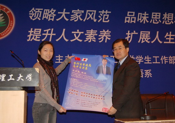 讲座由党委学生工作部关宏主持。提问环节结束后,学生工作部关宏代表学校将讲座的海报和具有我校特色的礼品赠送给了金教授。