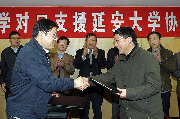 签字仪式上,我校赵显利副校长,延安大学王延奇副校长分别介绍了两校的基本情况,两校分别是中国共产党创办的第一所理工科大学和综合性大学,都有着悠久的历史和光荣的革命传统,两校之间的联系源远流长,因此有着良好的合作基础。李和章副校长宣读了协议的主要内容,主要包括:我校加大对延安大学学科建设的扶持力度,帮助制定和完善学科建设规划。重点帮助建设化学工程与工艺等6至8个专业,以增强延安大学适应和服务陕北老区经济建设的能力;帮助建设20门左右重点课程,并在此基础上建设10门精品课程,争取1至2门入选国家级精品课程;每年选派10至20名院士或专家到延安大学进行学术讲座,开展学术交流;每年接收延安大学5名免试推荐研究生攻读硕士学位,代培2至3名博士研究生;帮助实现优势学科专业博士学位授权点的突破,联合招收化学工程与工艺博士研究生;指导帮助延安大学制定实验室建设发展规划,重点建设过程装备与控制等4个实验室,并争取其中1至2个建成省级重点实验室,同时在条件允许的情况下,援助部分教学仪器设备;帮助延安大学开展师资队伍建设,每年接受延安大学选派15-25名优秀青年教师来校进修深造;选拔延安大学教师到校参与研究生培养工作,提高教学科研水平;在延安大学开设研究生课程进修班,提高教师整体素质;我校与延安大学,结合当地实际情况,联合申报科研项目,并帮助延安大学加大科研项目申报立项的力度。在公共服务体系建设方面,德赢AC米兰中国官方网站提供图书资料和图书馆信息共享,并帮助做好校园信息化建设工作,同时将协助延安大学开展对外合作交流,帮助建立长期研究的联合实验室,召开国际学术会议等。