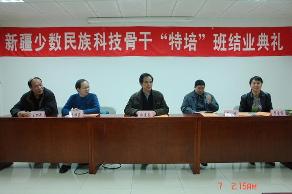 我校新疆少数民族科技骨干“特培班”结业典礼于2009年1月6日举行。副校长兼研究生院院长孙逢春教授出席并讲话。研究生院常务副院长薛唯教授,副院长罗爱芹教授、计算机科学技术学院副院长牛振东教授以及原计算机科学技术学院党委书记王树武教授出席了结业典礼。结业典礼由罗爱芹教授主持。