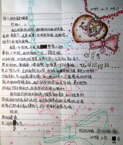3月初,基础教育学院刘毅同学收到了灾区小朋友的回信。信的内容简短朴实,但充满了坚强与乐观的精神。我校同学的爱心行动得到了回馈,在这个互动过程中,同学们和灾区小朋友都是受益者。