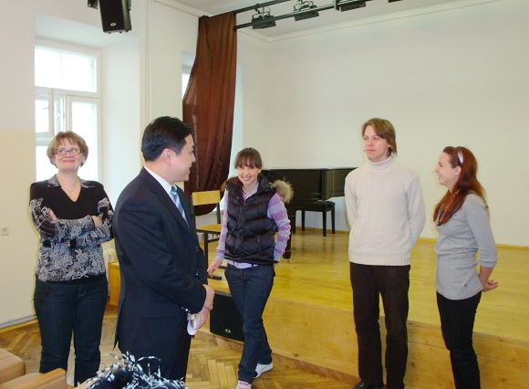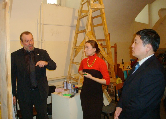 为了更好的了解莫斯科大学艺术学院的教学情况,胡校长在艺术学院院长罗伯达诺夫教授的陪同下访问了艺术学院的各个专业,其中包括美术专业、舞蹈专业、话剧表演、音乐专业等。参观了各类工作室以及各专业学生的上课情况,并同师生们进行了亲切的交流。
