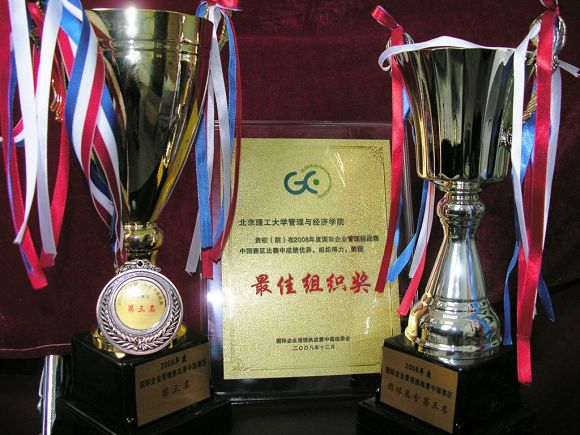 2008年度国际企业管理挑战赛中国赛区经过三个多月的激烈角逐,近日在北京建国饭店圆满落幕。我校光辉岁月队经过奋力拼搏获得季军,斯玛特队获得第五名,并且获得团体总分第三名,GMC中国区金奖,最佳组织奖等多项殊荣。