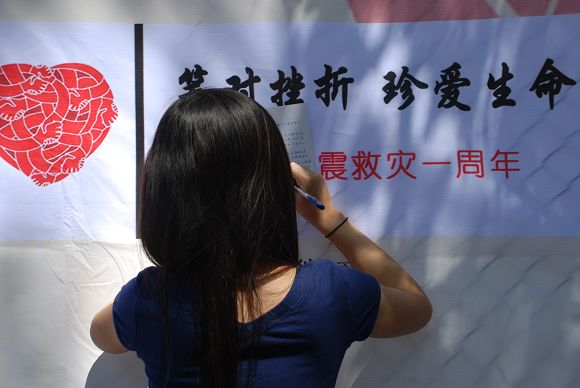 2009年5月12日中午,校研究生会组织开展了“笑对挫折 珍爱生命”主题活动,号召青年学生向一年来在废墟上追寻梦想、重建家园的灾区人民学习,正确对待生活学习中所面临的挫折和苦难,珍爱每一个生命,进一步在校园中弘扬伟大的抗震救灾精神。