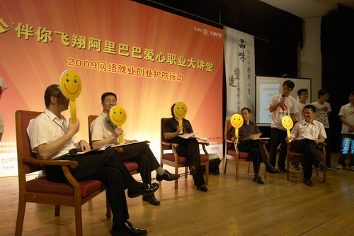 到场的四位嘉宾及校团委张巍老师担任评委,对这二十名同学进行现场面试。现场气氛紧张而热烈,同学们表现得沉着冷静机智。经过激烈角逐,来自管理与经济学院的研究生王琦和信息与电子学院研究生宁宁两名同学脱颖而出,最终获得了免费去杭州参加阿里巴巴十周年庆典的机会,并有其他50名同学也将被推荐到相关企业实习。