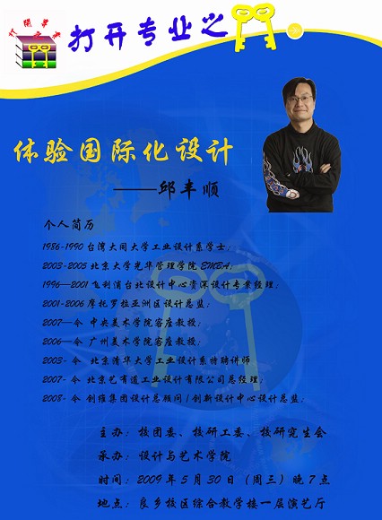2009年5月20日晚,德赢AC米兰中国官方网站设计与艺术学院打开专业之门系列讲座之体验国际化设计在良乡校区综合楼演艺厅举行,本次讲座的嘉宾是邱丰顺老师,同时出席讲座的有07级辅导员毛昭君老师、08级辅导员都超老师。